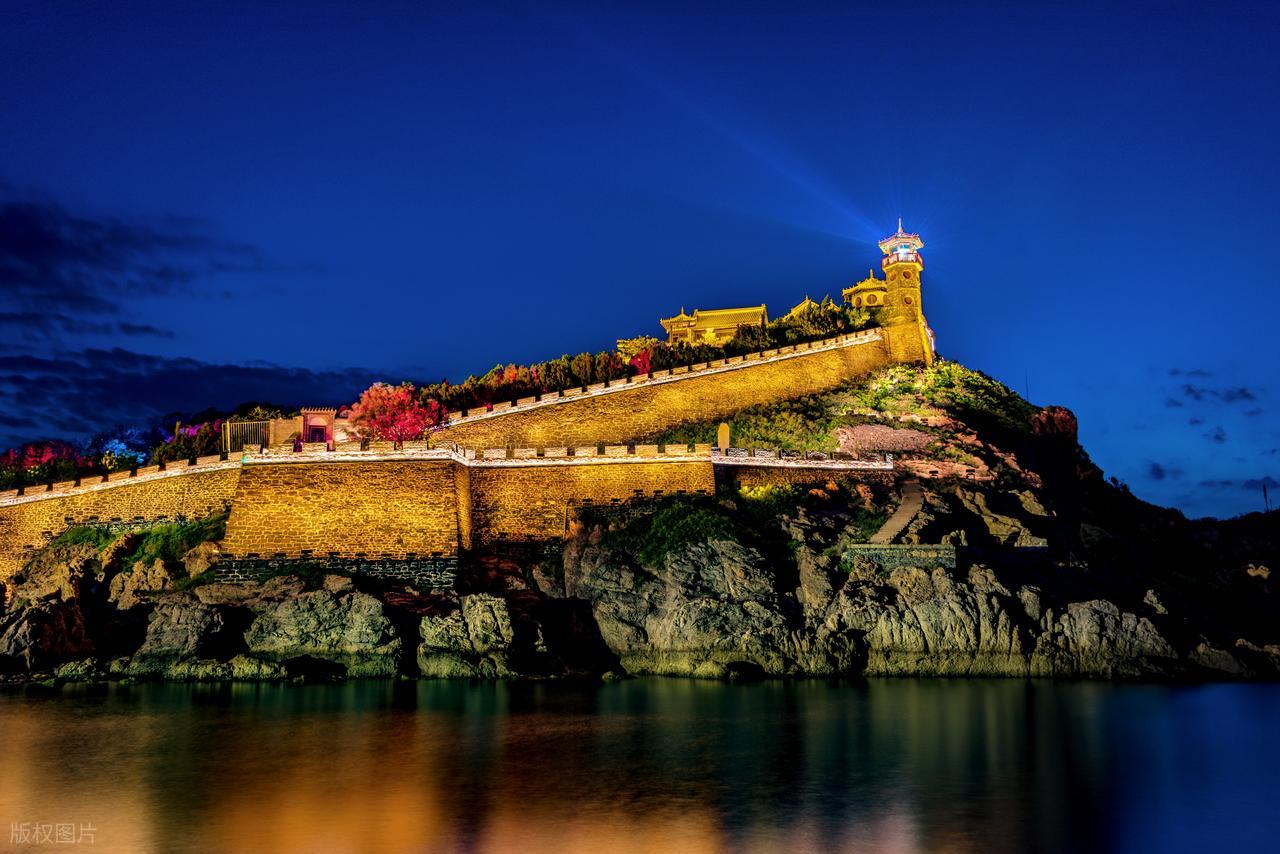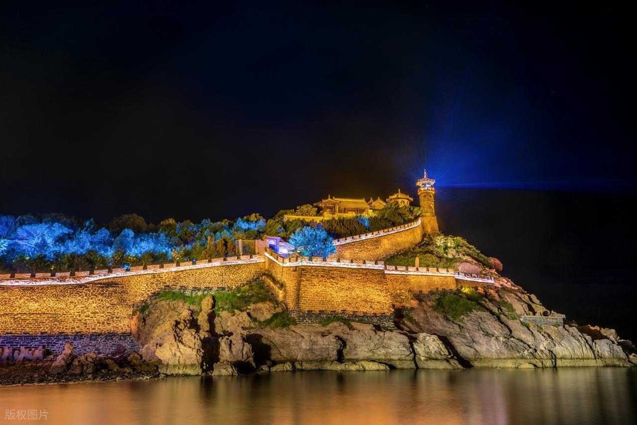 烟台蓬莱阁夜景,古建筑与 “海市蜃楼” 光影交融